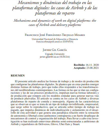 Mecanismos y dinámicas del trabajo en las plataformas digitales: los casos de Airbnb y de las plataformas de reparto